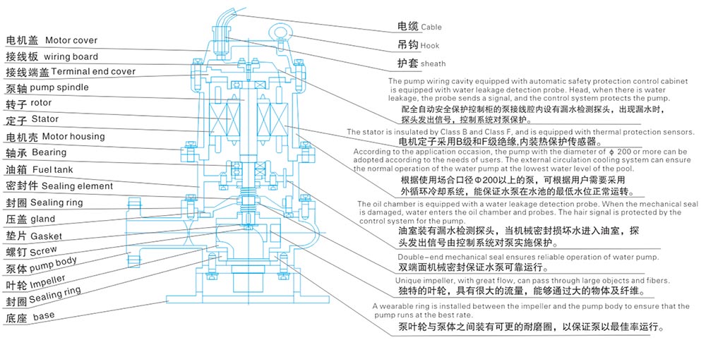 WQ型无堵塞潜水排污泵是结合国内水泵的使用特点而研制成功的新一代泵类产品,具有节能效果显著、防缠绕、无堵塞、自动安装和自动控制学持点。在排送固体颗料和长纤维垃圾方面,效果明显。