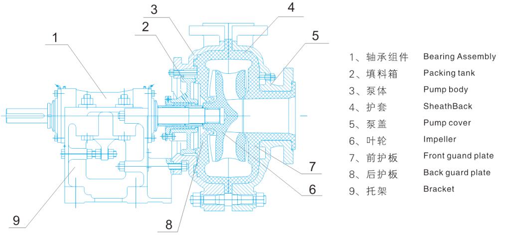 M、AH、HH型泵的泵体具有可更换的金属内衬或橡胶内衬,叶轮采用金属或橡胶材料。HH型泵的泵体内衬和叶轮仅采用金属。